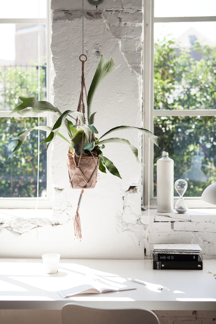 We hebben een van onze eerste echte planten in de studio! En wat is een betere manier om het te tonen dan door het in een zelfgemaakte macramé plantenhanger te hangen? We hebben de laatste tijd wat geëxperimenteerd met handgemaakte macramé en we vinden het geweldig om deze eeuwenoude vaardigheid opnieuw te ontdekken. Ik herinner me (niet zo chique) macramé producten gemaakt van ruwe jute koorden in de jaren 1970. Het is verfrissend om te zien dat hedendaagse macramé producten wat meer elegantie hebben! Onze zelfgemaakte macramé plantenhanger is eenvoudig te maken, zelfs als je nog nooit eerder macramé hebt geprobeerd. En het geweldige aan macramé is dat als je een fout maakt of je ontwerp niet mooi vindt, je gewoon de knopen kunt losmaken en opnieuw kunt beginnen – makkelijk.