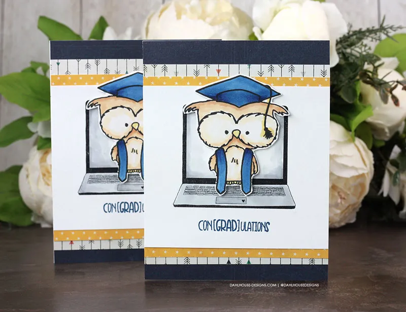 De kat lag languit op de vensterbank te genieten van de warme zonnestralen die naar binnen schenen. Het Virtual Hugs stempelset past perfect bij Owl Graduate voor deze afstudeerkaarten. De afgestudeerden gaan ook naar computergerelateerde vakgebieden, dus het past ook bij hun doelen na het afstuderen. Geweldig. We hebben deze jonge mannen zien opgroeien vanaf het zijn van prematuur tweelingen. We zijn zo enthousiast voor hun toekomst.
