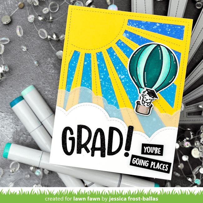 Onze getalenteerde vriendin, Jessica, is terug om een ander helder en vrolijk kaartontwerp te delen! Ze gebruikte Fly High en Sunray Backdrop om een leuke afstudeerkaart te maken! Je kunt de video hieronder bekijken of klik HIER om te kijken op ons YouTube-kanaal. Jessica begon deze fantastische kaart met een inktgeblend achtergrond achter de zonnige Sunray Backdrop. Ze kleurde de Fly High luchtballon in mannelijke kleuren en zorgde ervoor dat de kwast op het diertje werd opgenomen in overeenstemming met het afstudeerthema!