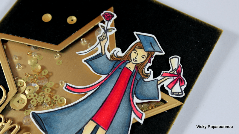 Ik heb de afstudeerstempel van Penny Black gebruikt ( SBC | BLT | SSS | AMZ ). Ze is het perfecte middelpunt om een kaart te maken voor elk meisje in je leven dat net is afgestudeerd! Om mijn kaart er opvallend uit te laten zien, besloot ik om een sterren shaker-venster te maken en koos ik voor zwart en goud als kleurencombinatie. Ik gebruikte mijn Nuvo Creative Pennen om haar in te kleuren.