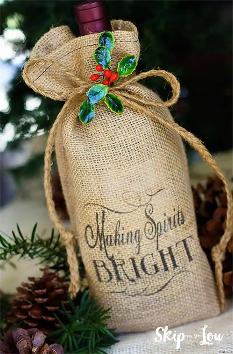 Deze zelfgemaakte bedrukte jute flessentas is een leuke manier om een wijnfles, gearomatiseerde likeuren, gourmet olijfolie of gearomatiseerde azijn op te fleuren voor het geven van cadeaus tijdens de feestdagen. Je kunt zelfs je eigen fles Ierse roomlikeur maken. Het kost slechts een paar goedkope benodigdheden om deze tassen te maken en je zult verbaasd zijn hoe gemakkelijk je kunt printen op jute met je printer. Deze maand delen we meer dan 100 zelfgemaakte cadeauhandleidingen. Deze maand heb ik samengewerkt met enkele van mijn favoriete bloggers om de beste zelfgemaakte cadeau-ideeën te delen. We hebben meer dan 100 handleidingen, dus je zult de beste zelfgemaakte feestdagen ooit hebben! Mis deze makkelijk te naaien ritszak niet die gisteren werd gedeeld.