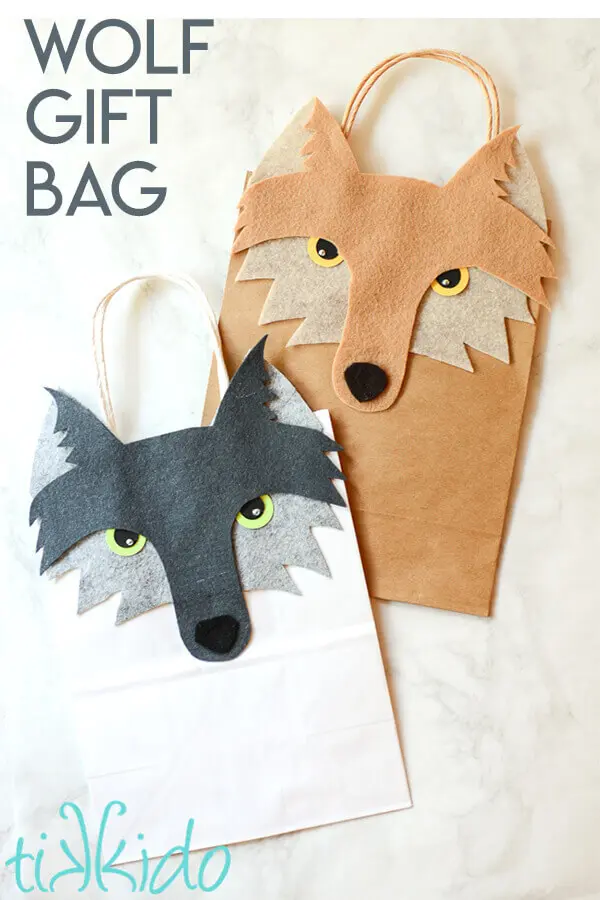 Ik ben dol op creatieve cadeauverpakkingsprojecten (en heb er al veel gedaan). Mijn dochters recente wolventhemafeest gaf me een leuke reden om een nieuw idee voor een cadeauzakje te bedenken voor de bedankjes, en ik heb deze wolf cadeauzakjes gemaakt om alle leukigheden in te doen die ik had gemaakt.