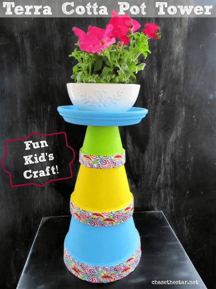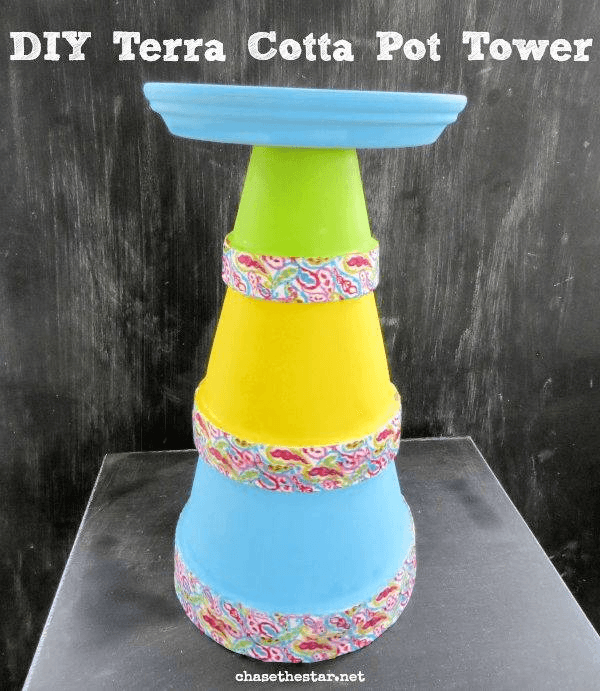 Ja! Je hebt het goed! Om een toren te bouwen van deze prachtig gekleurde potten! Ik geloof dat het een uniek stuk zal zijn dat minder ruimte zal innemen. Plaats de terracotta potten ondersteboven door de kleinste bovenaan te plaatsen en de grootste onderaan de toren. Voeg een schotel toe die we hebben gekocht aan onze toren. Houd ze veilig door ze stevig aan elkaar te bevestigen met een sterke lijm, zodat ze voor een langere periode bij elkaar blijven.